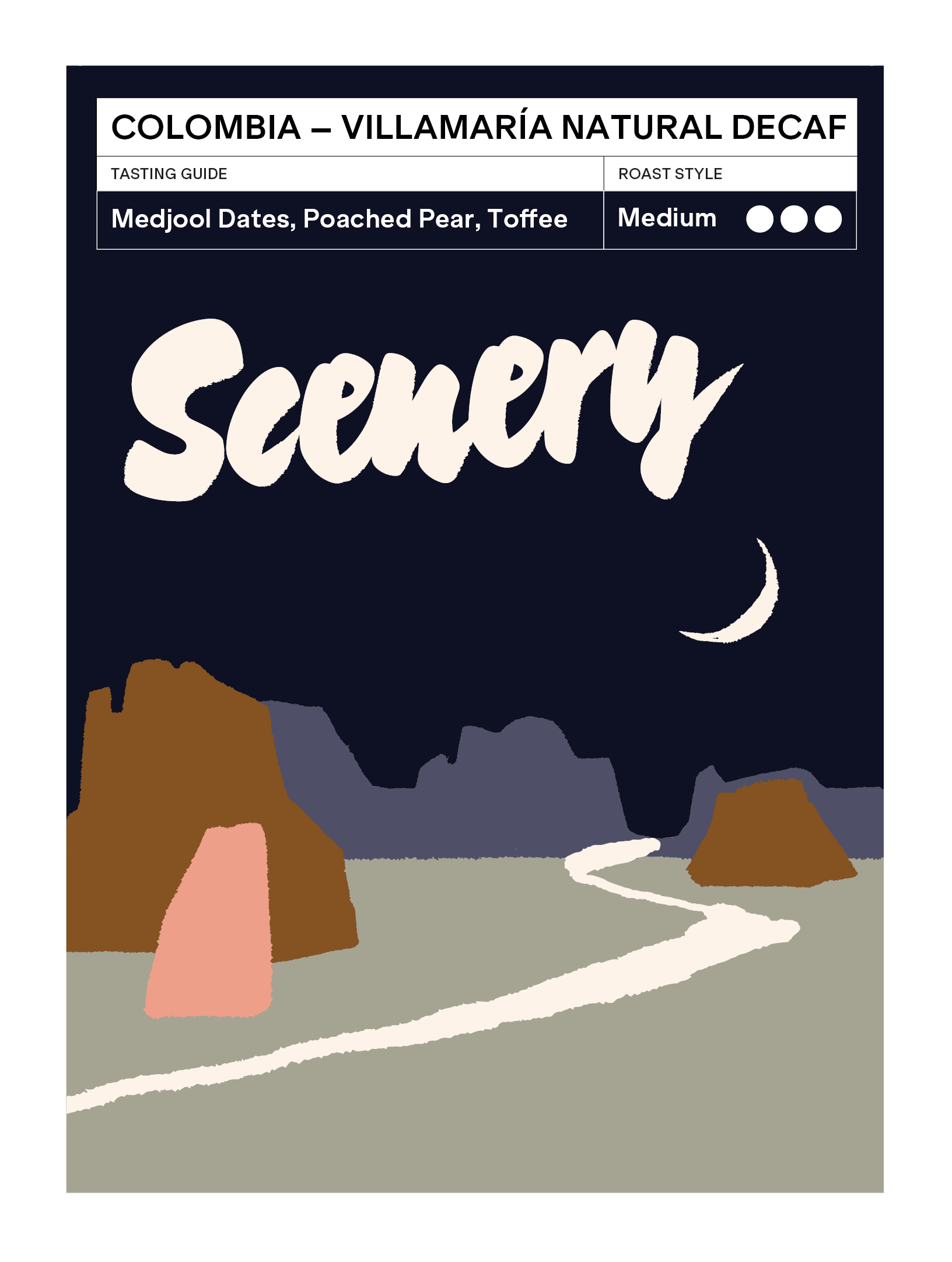 Returning to the very same decaf lot we first launched with Scenery, the Villamariá natural lot has some history. We're reliably told it might have been the starting gun on the trend of excellent decafs - as both one of the first naturals as well as one of the first 87+ lots to have been sent through the Descafescol plant in Manziales, all the way back in 2019.